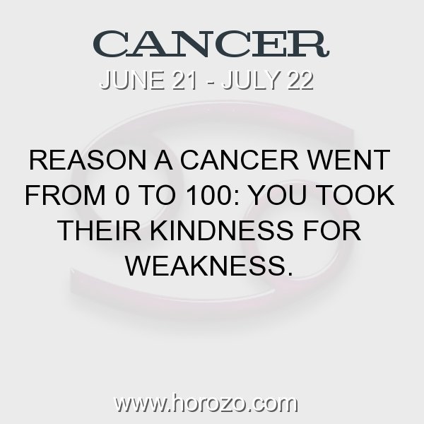 Cancers may be soft, but don't mistake that for weakness. With leukemia and lymphoma, cancer cells in the bone marrow can interfere with the normal production of blood cells. If the cancer moon is in a weak position in the horoscope, is placed in the 8th, 12th, or 6th horoscope house, and/or having major negative aspects like oppositions and squares, the emotions that it strives to arouse could often have a negative context. They almost never reveal their inner feelings. This can lead to anemia, and anemia can then lead to fatigue. Fatigue, usually described as feeling tired, weak or exhausted, affects most people during cancer treatment. A sign is something that others can see, such as a fever, vomiting, or fast breathing. While cancers do pride themselves in their kindness and emotional intelligence, they still have a toughness to them that can take you by. Other forms of leukemia occur mostly in adults. Focus on one thing at a time and everything will work out. Cancer is a water sign that is very intuitive, sympathetic and kind. In our last post, we detailed the 6 hallmarks of cancer originally described in 2001. Cerpt discover the strengths, weaknesses and characteristics of the cancer star sign.